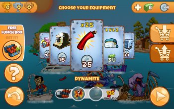 Tentunya untuk memenangi kompetisi Anda harus dipersiapkan dengan berbagai perlengkapan dan peralatan. Terdapat toko yang menyediakan perlengkapan seperti bahan peledak ataupun senjata unik lain yang digunakan untuk memancing seperti kaos kaki yang bau, atau binatang yang mengamuk. Selain itu juga di toko ini menyediakan perahu yang bisa Anda gunakan untuk melaksanakan kompetisi. Dan Anda juga bisa memilih karakter yang ingin Anda gunakan untuk kompetisi ini. Setiap karakter memiliki kelebihan masing-masing seperti Anda karakter yang cepat dan ada juga yang memiliki serangan yang kuat. Kelebihan-kelebihan ini bisa ditingkatkan dengan uang yang Anda dapat dengan mengikuti kompetisi. Game ini juga menyediakan in-app purchase untuk mempermudah Anda mengikuti kompetisi memancing.